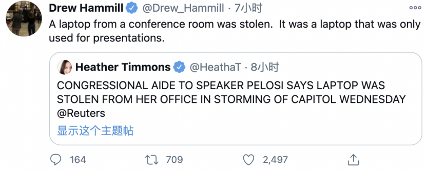 除讲话台之外,佩洛西的副幕僚长汉米尔还在推特上声称,佩洛西办公室的一台笔记本电脑在暴乱中丢失。