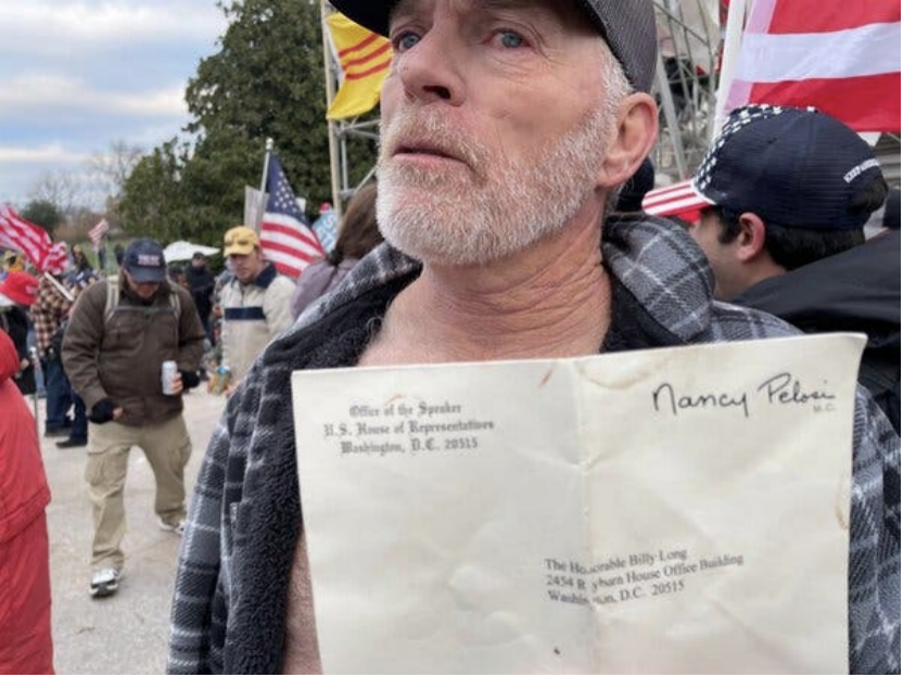 “我给她写了一张恶毒的便条,还把脚放在了她的桌子上。”他挥舞着从佩洛西办公室拿走的一个印有佩洛西名字的信封,并坚持说不是偷的,“我在她桌上放了一枚25美分的硬币。”
