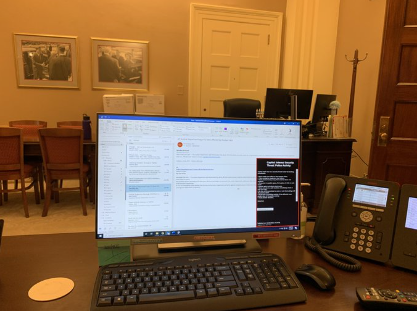 报道称,此前有记者发布了一张显示佩洛西办公室内部的推特照片。照片显示,由于工作人员急忙逃离,桌上一部台式电脑仍然开着,屏幕上显示一封电子邮件的内容。