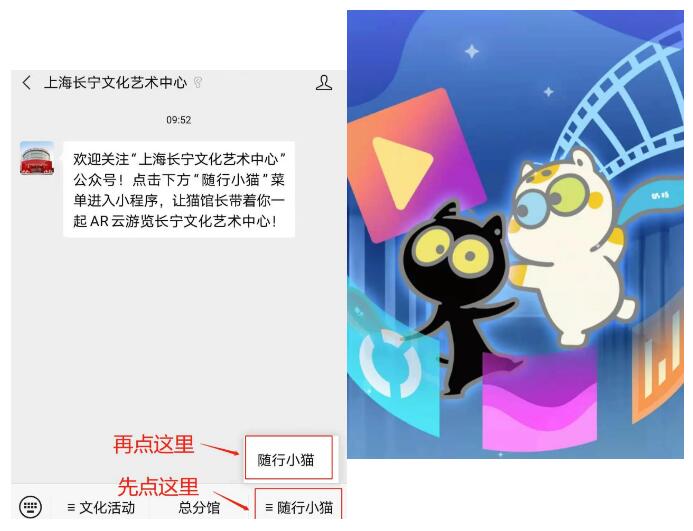 作为长宁“AR随行小猫”,“猫宁”和“奶特”此次身份的转变其实是长宁文化艺术中心最新推出的AR数字化导识系统,该系统被嵌入在中心官方微信公众号的电子菜单中,以小程序的形式呈现,点击“随行小猫”即可进入。