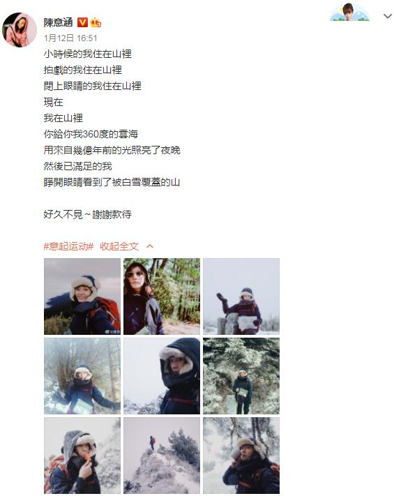 1月12日,陈意涵在微博晒出自己爬山的照片,说道:“小时候的我住在山里,拍戏的我住在山里,闭上眼睛的我住在山里,现在,我在山里,你给你我360度的云海,用来自几亿年前的光照亮了夜晚,然后已满足的我,睁开眼睛看到了被白雪覆盖的山。好久不见~谢谢款待。”照片中她头戴深色毛绒护耳帽,穿着深蓝色的登山服和黑色登山裤,手拿登山杖,身后的红色背包十分亮眼,胸前还背了一个绿色的小包,在山顶拿着写有“桃山”的牌子拍照,身后白雪皑皑。她还和身后的云海合影,微笑看着镜头,十分有活力,美景如同仙境。粉丝评论:“今天是诗人大发吗?”她回复:“难得。”