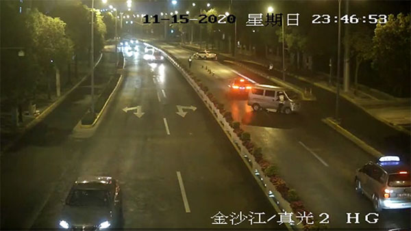 2020年11月15日深夜11时46分许,普陀区金沙江路近伯士路西侧约100米处,一辆小型面包车遇交警设卡检查,拒绝停车并沿马路多次调转车头。期间交警站立其车头副驾驶侧,使用拽拉其车门和雨刮器,拍打车窗等方式拦截,面包车仍不顾车头处于拖带交警的危险状态,强行将车行驶到金沙江路主道旁的非机动车道上,摆脱交警后加速冲卡逃窜。