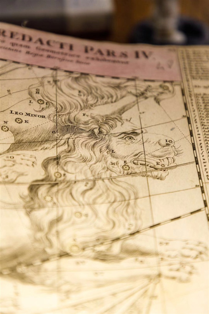 据悉,展览的主体是七本来自欧洲的华丽星空图集,这也是它们在国内的首次集中展览。其中,年代最悠久的是1535年版的《天文的诗歌》。这是一部古老的星座题材故事作品,由古罗马作家许癸努斯写著。书中描述了托勒密48个星座中的47个,主要围绕与星座有关的希腊和罗马神话展开。它所绘制的星座形象对后世星图影响深远。另一本1742年的《多贝玛亚星图》,是18世纪最重要星图集之一。书中不仅包含10张星图,还有大量宇宙天体图表,共有30幅铜版画作品。其中涉及行星系统理论、椭圆理论、月球理论和彗星理论。