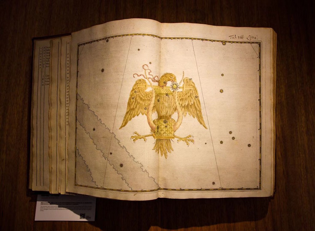 值得关注的是,展品中最珍贵的一本星图是1603年编制出版的西方四大古典星图之首——拜耳星图。拜耳星图由51幅铜版印制的星图构成,是第一部覆盖全天的星图集。此版本的特别之处在于全部星图均为17世纪早期人工着色,精美细致。书后还附有厚厚的手写星表。与此同时,它的艺术性也不容被忽视——从缀满鲜花和果实的北冕座再到长满香蒲和矮草的波江座,从半人马座华美的饰物再到天琴座雄鹰繁复的羽毛纹路,甚至在南天星图中漂浮的一大一小两片“星云”,种种星座绘制中的细节让人惊叹,这正是科学与艺术的一次完美交融。