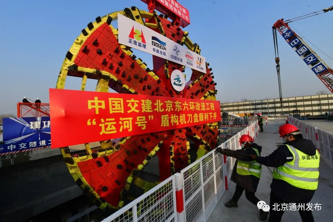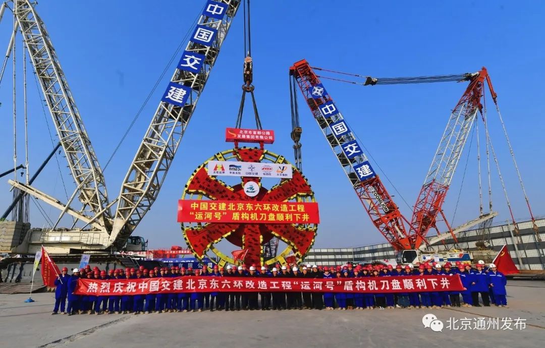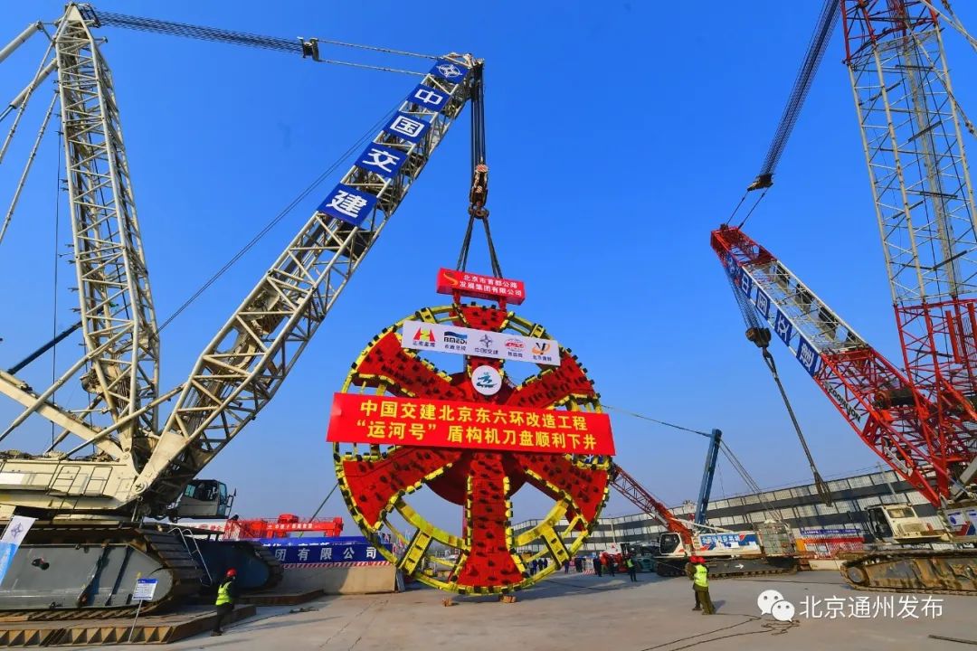 昨天(1月20日)下午,在东六环改造工程施工现场,两台履带吊联合进行抬吊、翻身作业后,顺利将“运河号”盾构机刀盘,缓缓下放到始发井井底。待定位安装后,将开展管线联接、调试等后续工作,预计将于春节后始发。