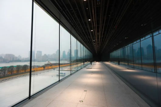 在二层、三层,这里拥有浦东美术馆最具标志性的两座“镜厅”。“镜厅”也俗称“大玻璃展厅”,位于建筑沿江一面的狭长区域,构成55米长、5米宽的景观通道。展厅安置的最大一块玻璃,高度为12米,重达10吨,这也是玻璃厂家迄今定制的最大一块玻璃,技术攻关难度极高。透过晶莹剔透的玻璃,可欣赏水天一色的黄浦江面。“镜厅”的背面则是单向透视结构玻璃,既是一面镜子,也是一个LED大屏。浦东美术馆负责人朱亚萍表示:“屏幕不开的时候,观众可从镜子里看到黄浦江对岸反射出的外滩镜像。大屏打开时,又可以展示新媒体艺术。观众无论从对岸的外滩,还是浦东滨江,都可以看到其中展示的艺术品。”