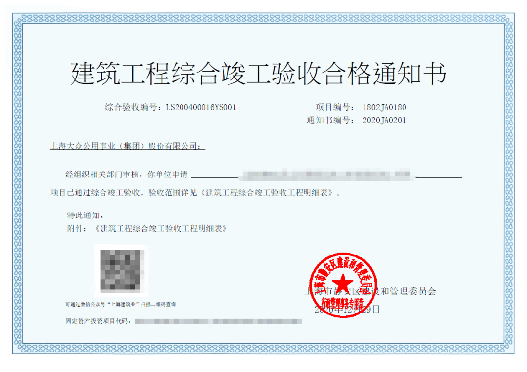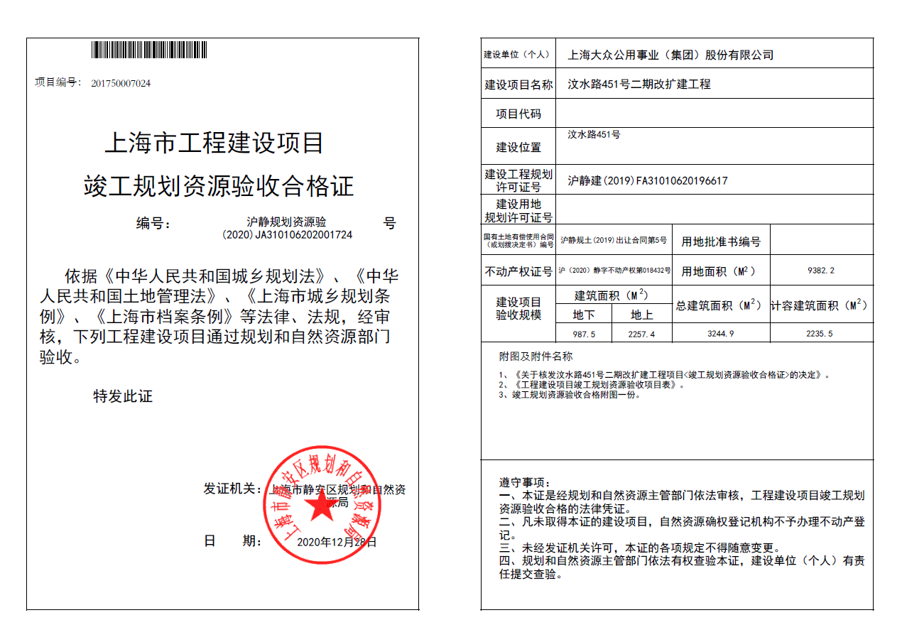 2020年12月28日出具竣工合格证:区规划资源局在现场核查后,当天出具《上海市工程建设项目竣工规划资源验收合格证》。