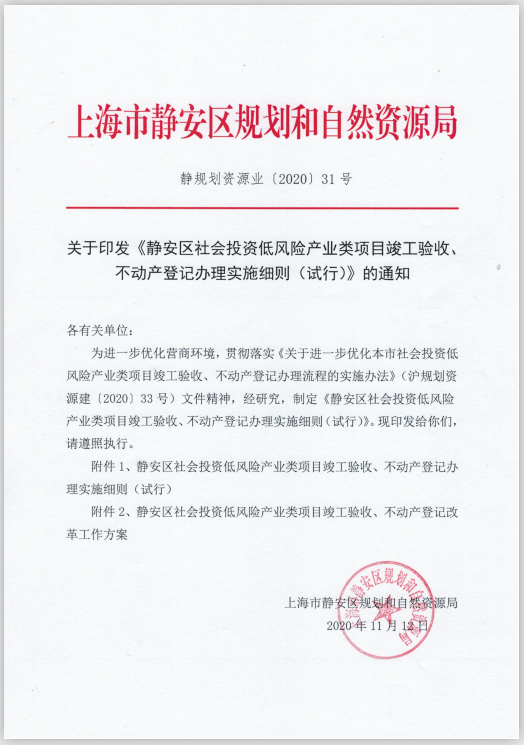 在静安区规划资源局牵头、区审改办推动下,区建管、绿化、环卫、交通、交警、卫生、民防、房管、税务、不动产登记等部门参与讨论研究,区规划资源局于去年4月出台《静安区社会投资低风险产业类项目竣工验收、不动产登记办理实施细则(试行)》,将竣工验收及不动产登记全流程审批时间从1个月压缩至5个工作日(3.5+1.5),受理材料精简幅度达70%。