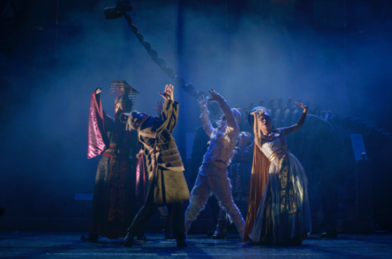 剧中还有不少技巧难度很高的舞蹈动作,比如,木乃伊缠着厚厚的布带,兵马俑穿着坚实的软甲,要完成旋转、劈叉、空翻等歌舞场面。历史人物的穿着造型非常复杂,动作幅度也很大,在保证轻盈便捷的同时还要兼顾抢妆,其中一场五个角色要在40秒内同时完成侧台换装,对服装设计提出了很大的挑战。服装设计周月将假发设计成头盔式,所有的戏服也都根据演员的身材尺寸手工制作。剧中每一位市民、盗贼们脚上看似不起眼的皮鞋,都由进口专业舞蹈鞋改造后手工完成,以每一个细节保障舞蹈演员的安全舒适。