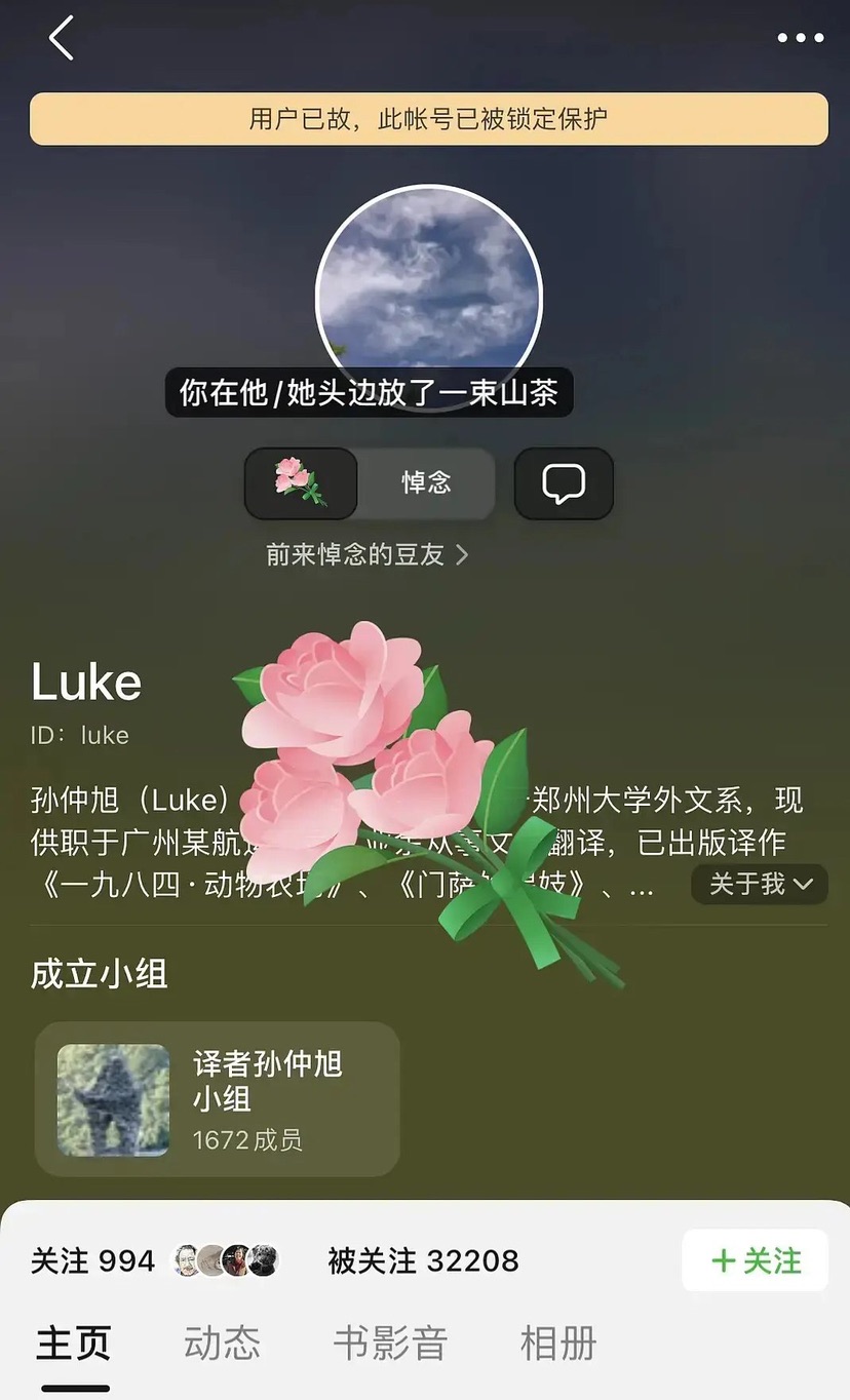 近日,有网友发现,豆瓣App 7.0版本上线了“悼念逝者”的功能。当打开已故用户的主页时,页面上方会显示“用户已故,此账号已被锁定保护”的说明,同时该用户头像下方会出现送花功能,点击花朵标志,就可为已故用户送上一朵山茶花。