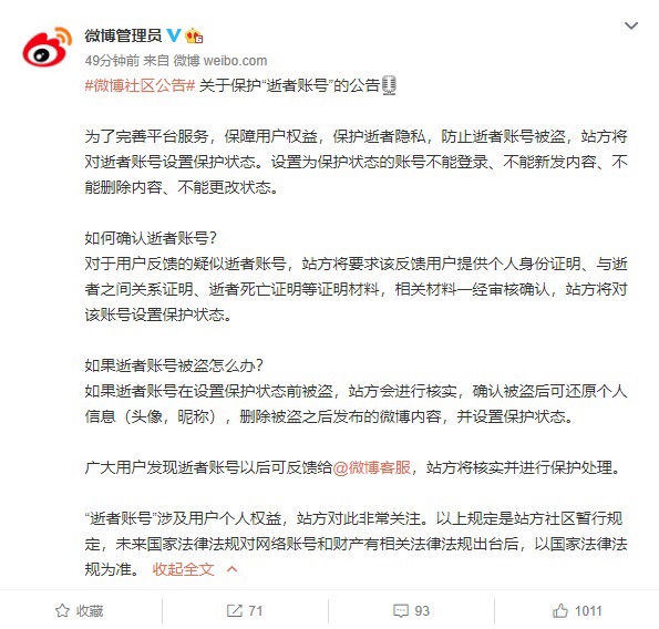 2020年9月,微博客服在平台上声明,为了完善平台服务,保障用户权益,保护逝者隐私,防止逝者账号被盗,站方将对逝者账号设置保护状态。如有被盗,微博确认信息后可对账号内容保护并为其恢复还原个人信息,并设置保护状态。