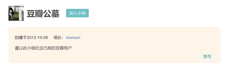 事实上,本次更新的悼念逝者功能不是第一次在豆瓣出现。2012年,豆瓣用户mansan就创建了“豆瓣公墓”小组,记录已经故去的豆友。人们可以在小组中给逝者写贴纪念,标记他们的生卒年月,留下他们曾经存在的痕迹。