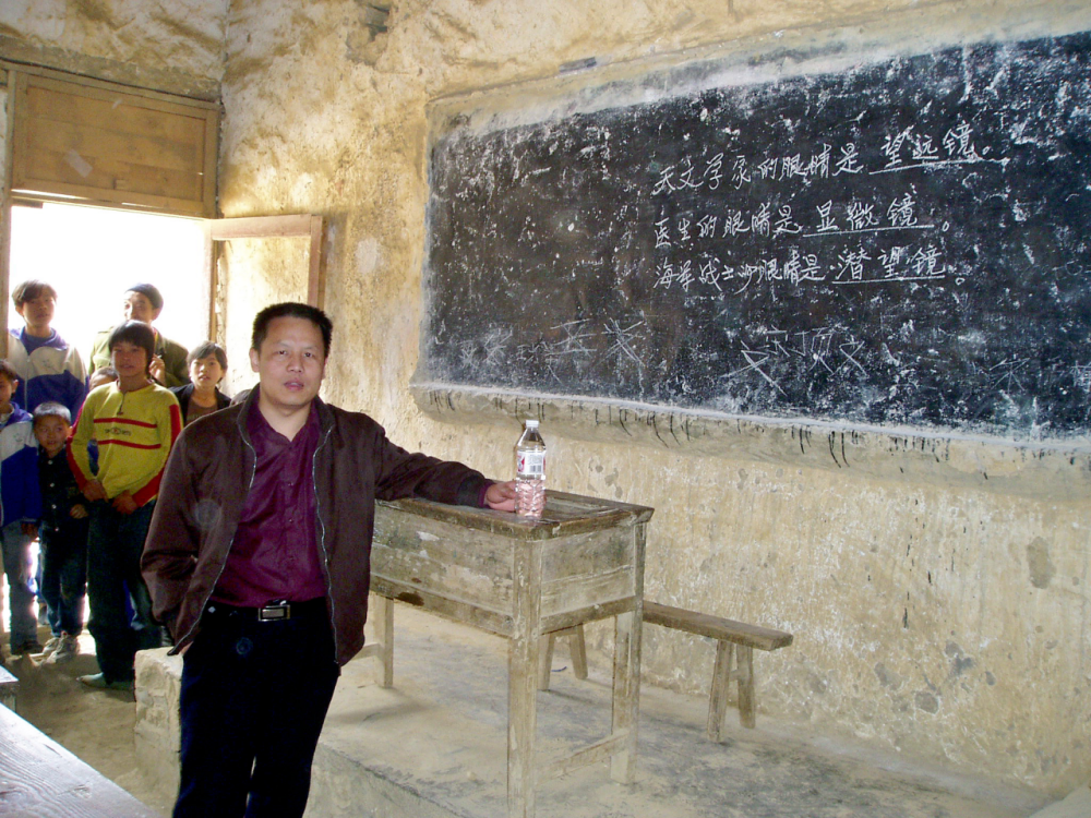 中科院国家天文台研究员彭勃在平塘县靛塘小学的老照片(摄于2007年),背景黑板上写着三行字:“天文学家的眼睛是望远镜,医生的眼睛是显微镜,海军战士的眼睛是潜望镜”。
