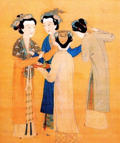 古代汉族妇女的头饰可谓热闹非凡,名目繁多。头簪时令鲜花,从汉代就有,唐代女性在春日有“斗花”的游戏,宋朱淑真在诗中自述“自折梅花插鬓端”,明唐寅《岁朝》写明代女性“鬓插梅花人蹴鞠”,都可见时令鲜花是女性首选。