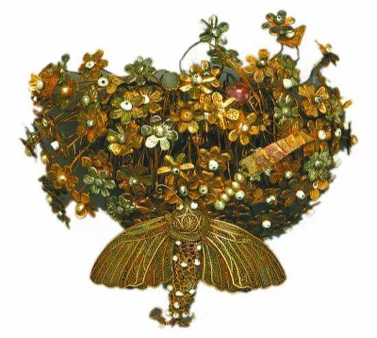除了鲜花,自古还有戴胜。戴胜,汉代称“华胜”,宋代称“闹蛾”,明清叫“闹嚷嚷”。这些首饰因材质、形状不同,名称各异。南宋周密《武林旧事·元夕》:“元夕节物,妇人皆戴珠翠、闹蛾、玉梅、雪柳、菩提叶、灯球、销金合、蝉貂袖、项帕,而衣多尚白,盖月下所宜也。”