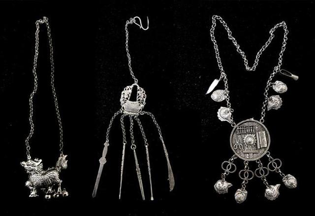银饰中有“银三件”和“银五件”之称,其中寓意丰富。有的女性衣襟上挂有刀、枪、剑、戟,主要用着辟祟驱邪之用。有的银饰上挂着十个铃铛,寓意“十全十美”;如果是一双鞋子造型,合在一起,就是寓意夫妻“和谐”;如是是葡萄、瓜类、鱼类,则象征“多子多福”;尺子、算盘、剪刀等生活日常用品图案,则寓意操持家务,“精打细算”。
