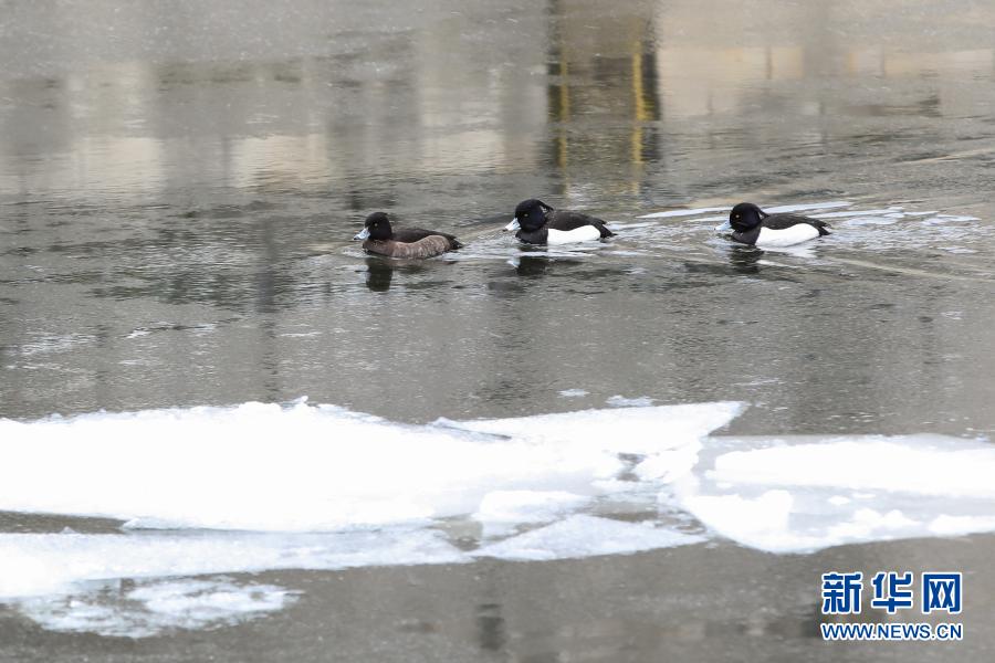 2月9日,在德国首都柏林,三只水鸟游过施普雷河上的浮冰。