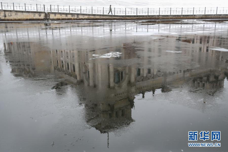 2月9日,在德国首都柏林,德国国会大厦倒映在漂有浮冰的施普雷河上。