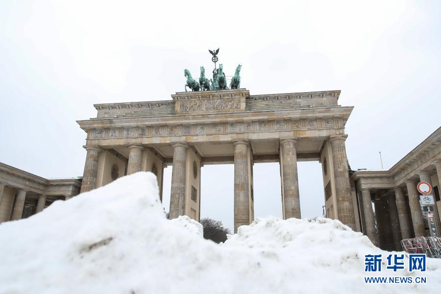 这是2月9日在德国首都柏林拍摄的勃兰登堡门前的雪堆。