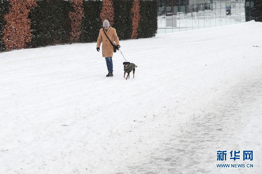 2月9日,在德国首都柏林,一名男子在雪中遛狗。
