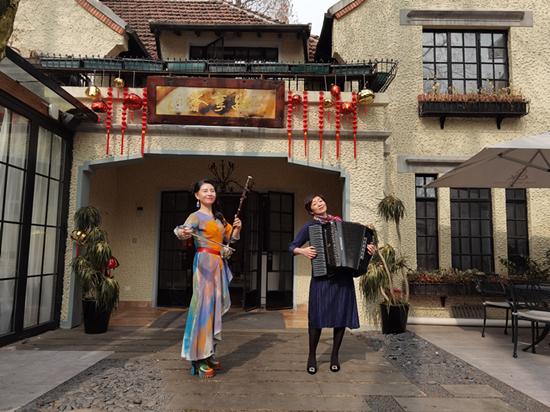 图说:手风琴演奏家王从余(右)与二胡演奏家马晓晖表演中