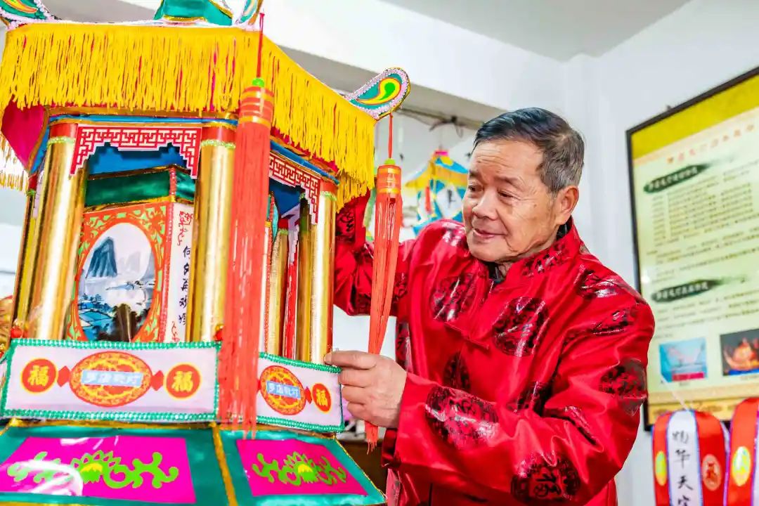 在朱玲宝的工作室,记者看到,彩灯制作通过朱玲宝的传承改良,构架方式已从过去的“绑扎法”演变为更易上手的“拼装法”,便于传承。而彩灯繁琐的制作步骤也已通过他的多年实践琢磨细化为设计、放样、选材、断料、弯折、成型、糊裱、装饰(贴花边等)、绘画(手绘、写上祝福语等)、光源等十个步骤。每一步可采取流水作业,负责断料的按照定下的尺寸排直钢丝,负责成型的将钢丝拗成方、圆等形状,交给绑扎组用胶布组装成型,随后由糊裱人员在框架上糊上彩色的绸缎布,并在接缝处装饰花边,贴上摇曳的流苏、彩珠使得彩灯更为靓丽。之后再由朱玲宝的老搭档沈金华为彩灯写上吉祥的祝福语,待油墨晾干后,安装上电源,就能够上街悬挂了。
