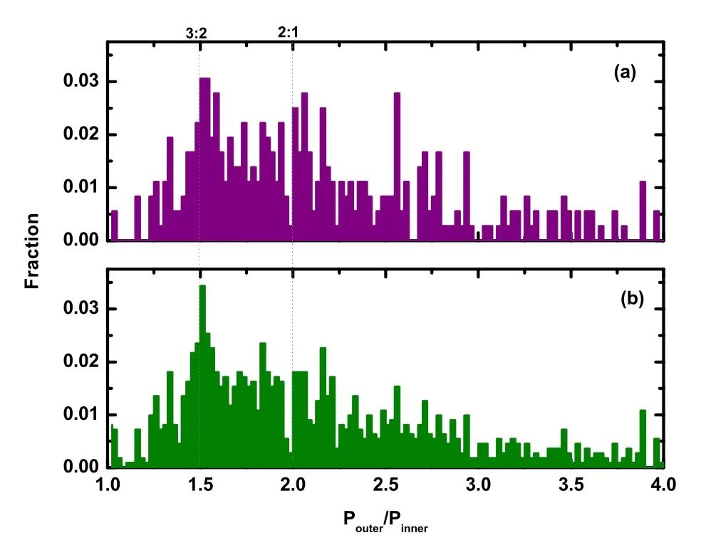 KEPLER系外行星候选体周期比分布[6](a)所有候选体;(b)三行星系统候选体