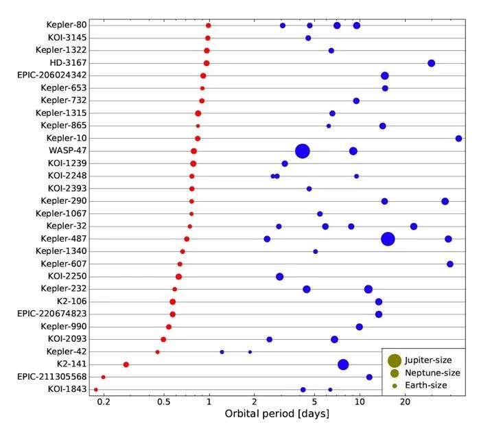 从拥有极短周期行星的多行星系统的构型分布来看,极短周期行星与系统中其他行星之间存在一定的距离。系统中其他行星往往处于一个较为紧致的构型中,而极短周期行星像是一个性格孤僻的孩子,紧紧地依偎在恒星母亲身旁。