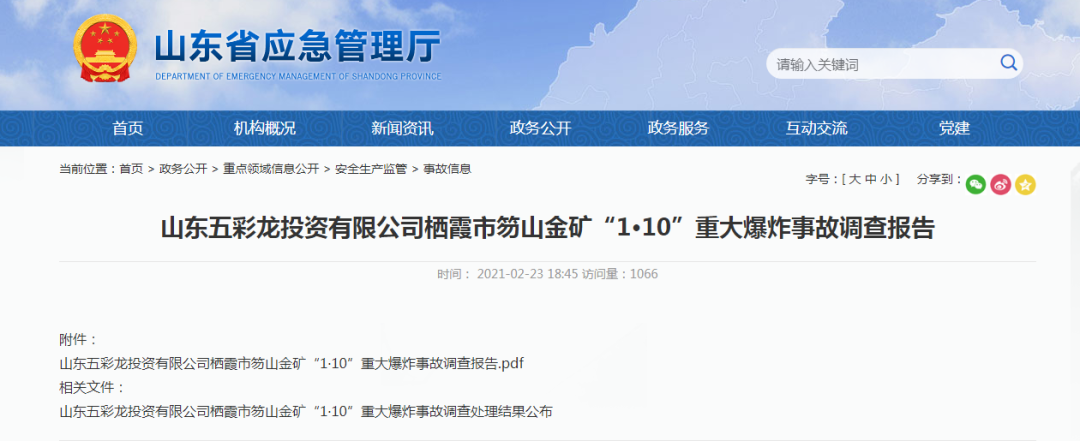 2月23日,山东省应急管理厅发布了该起事故调查报告,共50页、3万余字。原栖霞市委书记姚秀霞、原栖霞市市长朱涛的处理结果一并公布。
