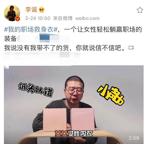 “#我的职场救身衣#,一个让女性轻松躺赢职场的装备,我说没有我带不了的货,你就说信不信吧。”2月24日,李诞发视频为某女性内衣品牌带货翻车,广告文案中写到“一个让女性轻松躺赢职场的装备”被指冒犯女性。