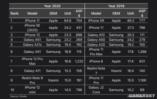 Omdia公布2020全球手机销量前十:5款iPhone上榜