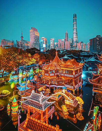 湖心亭光影环绕,与浦江对岸的上海中心遥相呼应。 资料图片