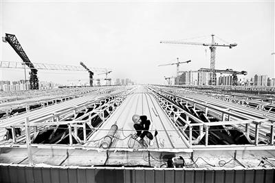 北京青年报记者日前来到北京城市副中心综合枢纽工程现场,施工现场横跨东六环,分为多个标段,场面宏大,塔吊林立,地上堆满各式各样的建材,各种工程机械轰鸣着,穿着各种颜色制服的工人忙着浇筑、焊接、运输。