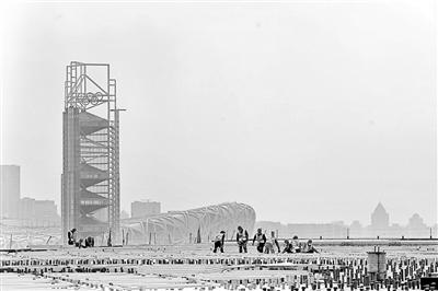 2月底,北京青年报记者在国家会议中心二期施工现场看到,场馆已经进入装饰装修阶段,在场馆东侧,巨幅大玻璃和乳白色单元体构成的“群鸟”幕墙,在阳光的照射下,仿佛大鹏展翅带动群鸟飞翔。