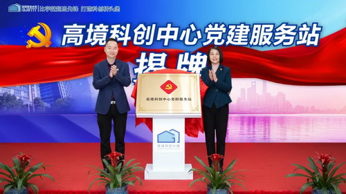 高境镇党委书记高虹军、镇党委副书记翁丽为高境科创中心党群服务站揭牌。