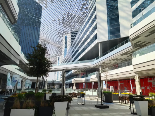 G60科创云廊(一期)配套商业区主要分布于整个建筑的内圈,整体分为三层。从西侧广场入口走进云廊,映入眼帘的是穹顶下交错的廊道、一路延展的长廊步道和各式各样的店铺。虽然整个商业综合体还在紧锣密鼓地筹备着开业,已经有不少店铺入驻开业了。