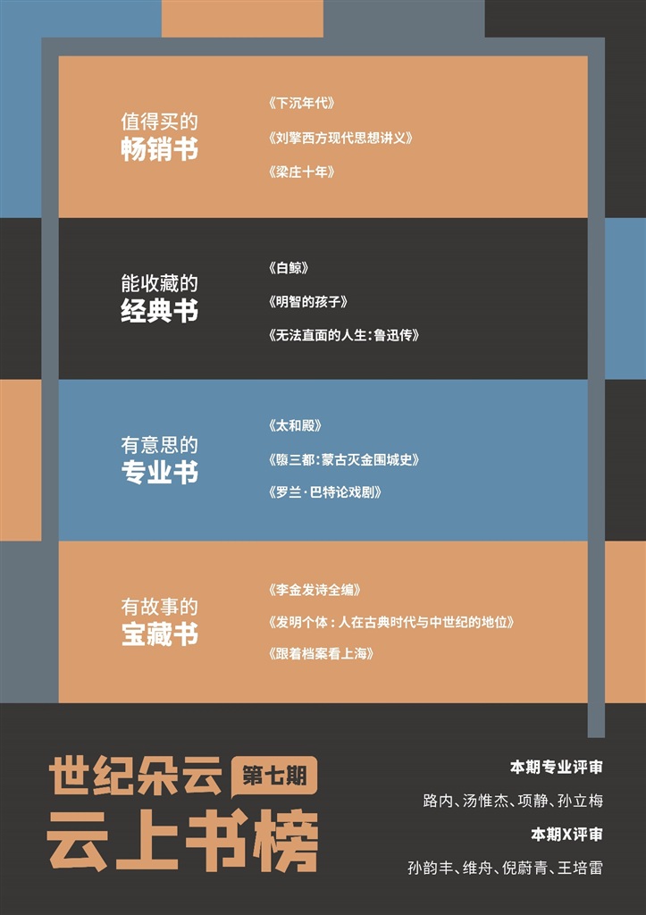 东方网3月19日消息;“世纪朵云·云上书榜”第七期榜单今日新鲜出炉,本期榜单的评选范围是2020年12月-2021年2月出版的新书。其中,“值得买的畅销书”上榜的是《下沉年代》《刘擎西方现代思想讲义》《梁庄十年》;“能收藏的经典书”是《白鲸》《明智的孩子》《无法直面的人生:鲁迅传》;“有意思的专业书”是《太和殿》《隳三都:蒙古灭金围城史》《罗兰·巴特论戏剧》;“有故事的宝藏书”是《李金发诗全编》《发明个体 : 人在古典时代与中世纪的地位》《跟着档案看上海》。