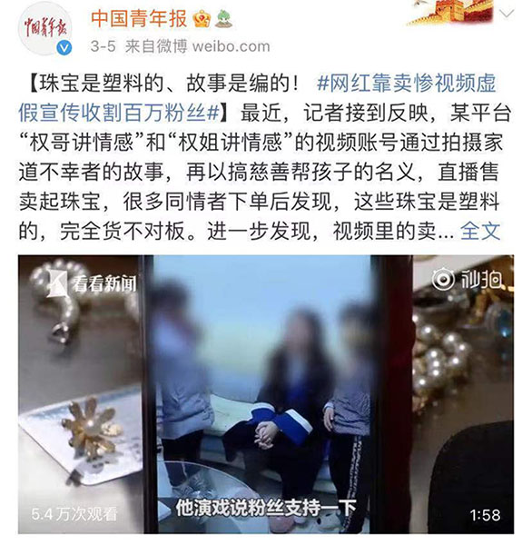 一边是做假戏真卖货的主播,另一边是真看戏买假货的消费者。消费者的同情心被无情利用,被主播们谋取不义之财。主播们为“吸睛”而博同情的做法需要“狠刹”。