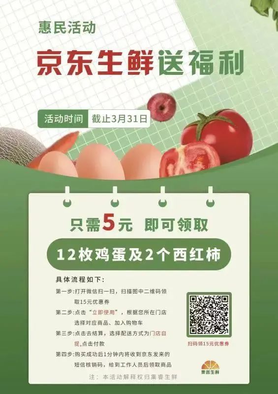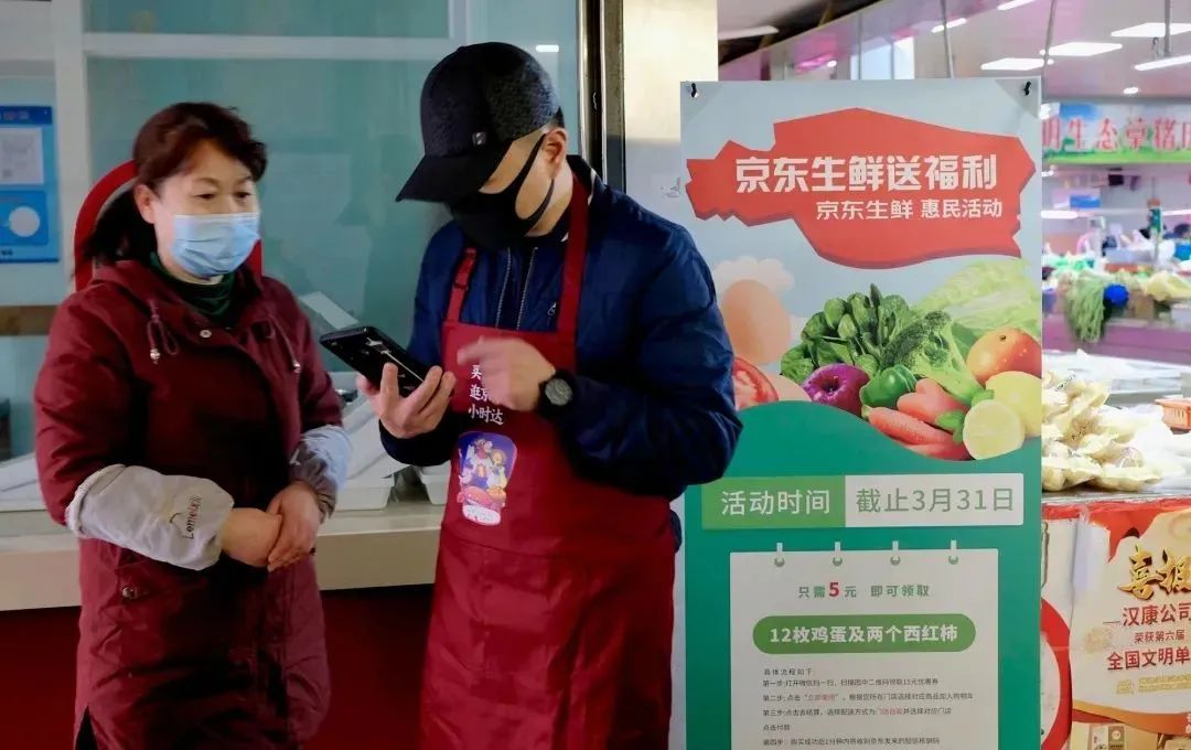 为了做好本次的“京东生鲜,惠民活动”,京东生鲜与落地服务商睿利众屹联合补贴参加活动的市场商户,促进市场销售。设立了扫码付5元购得12枚鲜鸡蛋、两个新鲜番茄的特惠项目。活动期间睿利众屹大量专业人员现场指导,帮助和确保每一位参加活动的市民真正领到实惠。