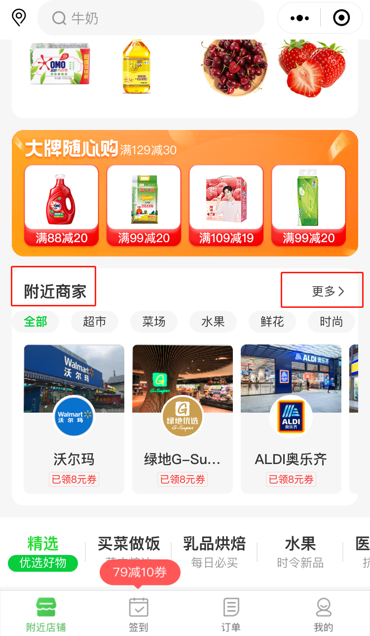 进入“京东到家”小程序——找到“附近商家”——点击“更多”——找到“集睿生鲜-康五菜市场”;