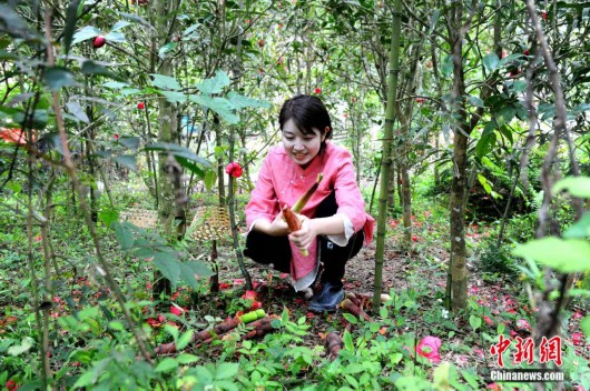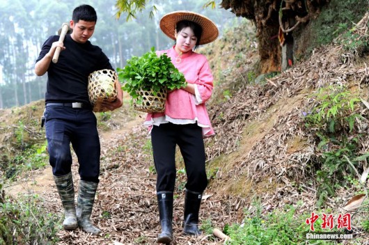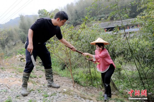 柯嘉华和周晰夫妻俩到山上挖笋。中新社记者 张金川 摄