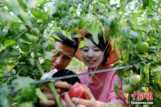 柯嘉华和周晰夫妻俩田间采摘西红柿,并打包寄给客户。中新社记者 张金川 摄