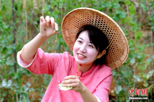 周晰在田间抓到菜虫。中新社记者 张金川 摄