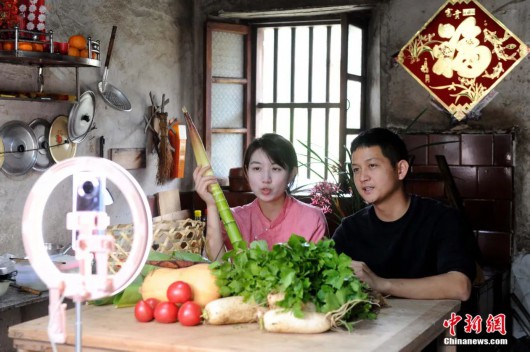 柯嘉华和周晰夫妻俩手机直播带货,推介他们种植的农产品。中新社记者 张金川 摄
