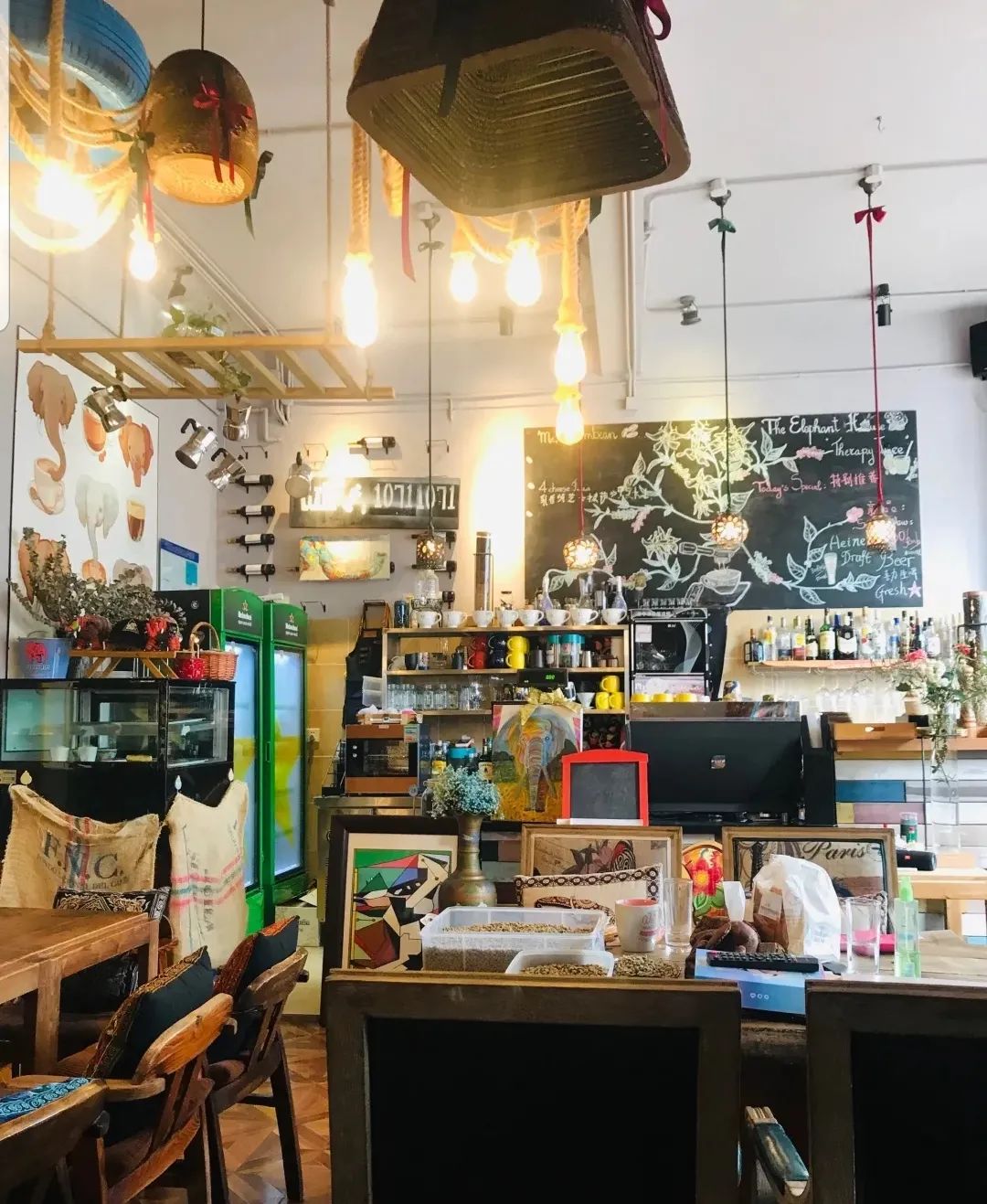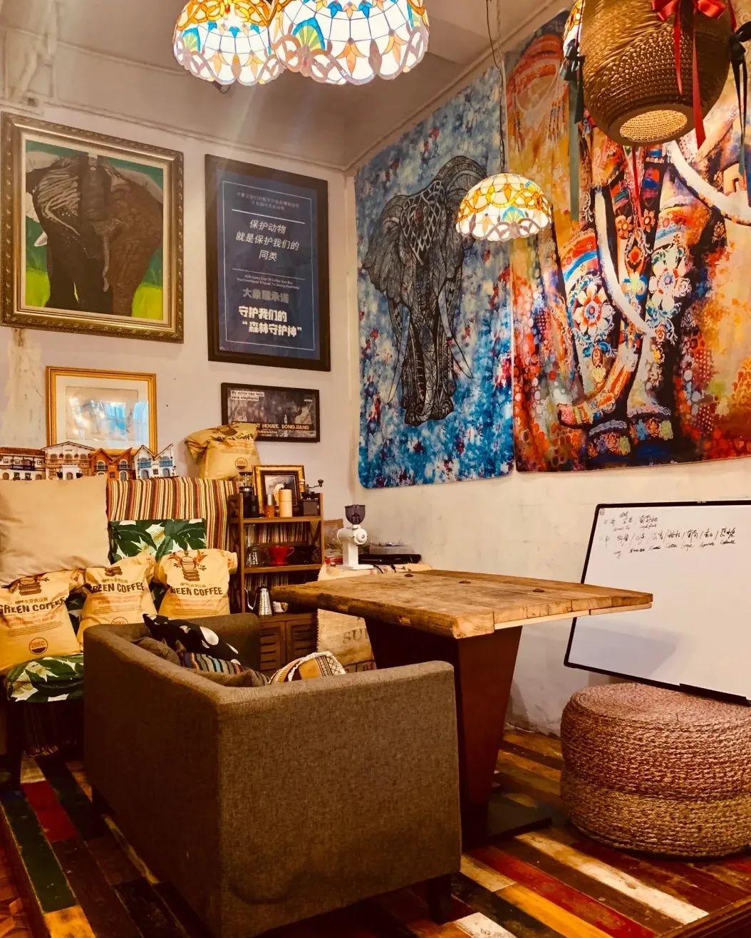这是一家充满工艺感的咖啡屋,大象的元素随处可见,明艳的色彩恣意张扬。小店颇具泰式风情,原木、皮具、铁艺……各不相同的元素和材质在小空间里相互碰撞,却因店主独到的审美与品味而让人感到和谐又自然。