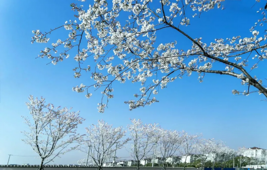 江桥镇海波路、嘉峪关路两侧的吉野樱进入盛花期,行走在路边,宛若置身于一片灿烂花海,让人心旷神怡。