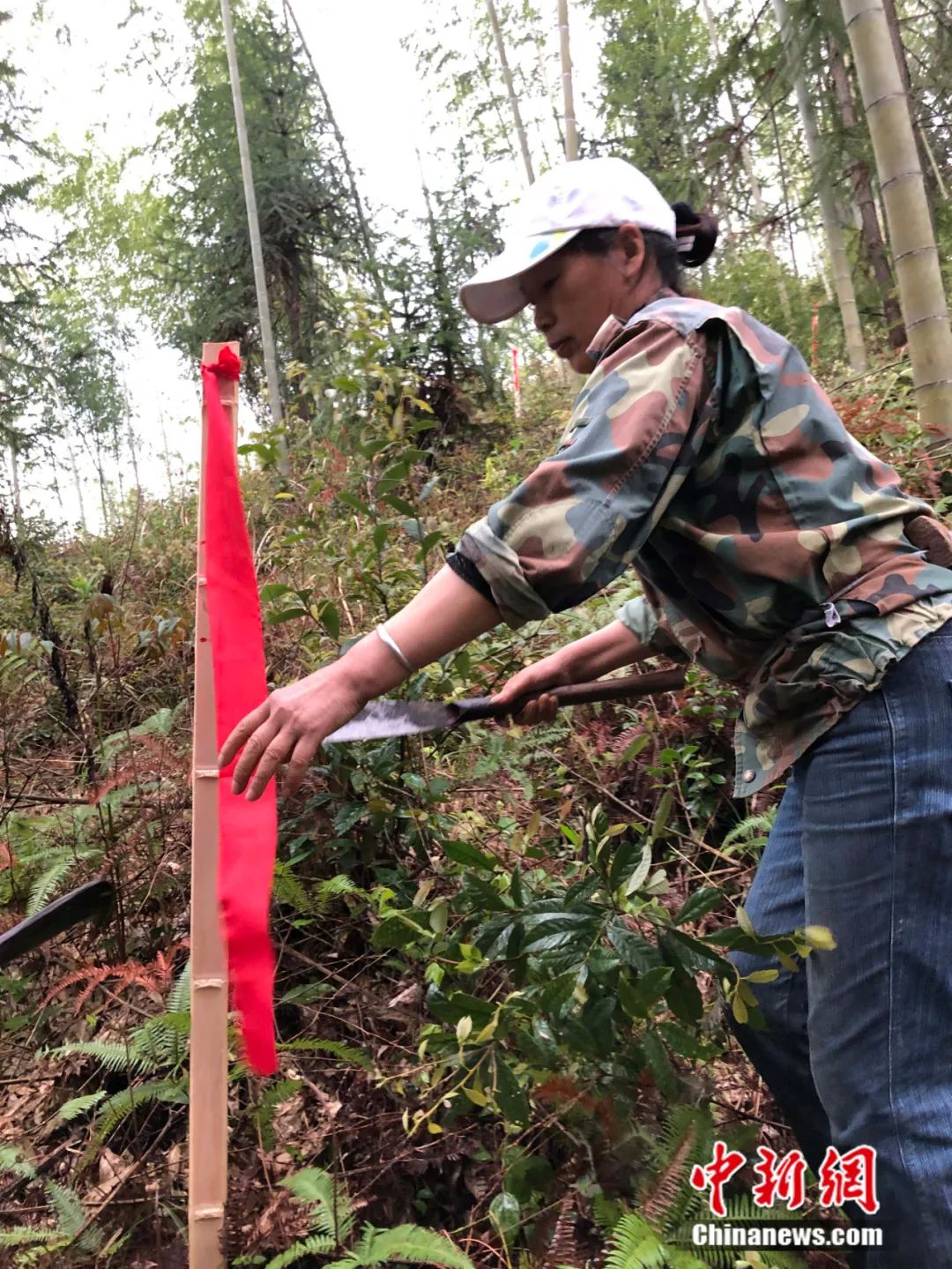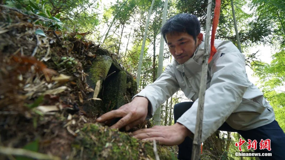 记者两度上山,都碰到村民杨朝林巡山扫墓。他和两位村妇腰缠镰刀,肩抗成捆“竹碑”,弥漫山间的水雾打湿了他们膝盖以下的鞋裤。