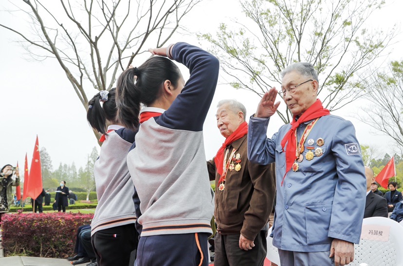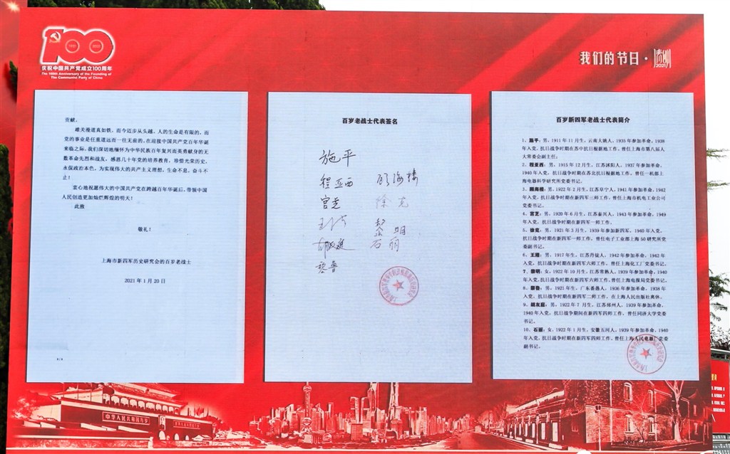 感恩典礼上,还特别播放了对五位新四军老战士的采访视频,徐克(100岁)、黎明(100岁)、鲍奇(97岁)、冯国樑(95岁)、刘汉山(93岁)分别表达了他们的百年信仰和百年愿望。