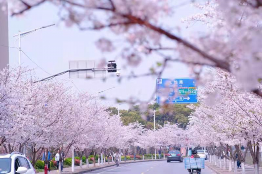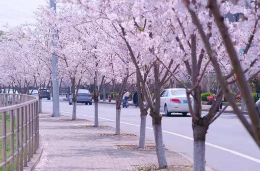 新跃路上,新跃路园三路至新跃路高东二路全长2公里左右,道路两旁皆是中樱,落英缤纷的时节从新跃路望去,街道两旁的居民房“躲在”樱花树后做背景,云蒸霞蔚、岁月静好。
