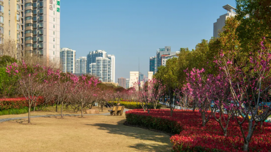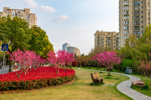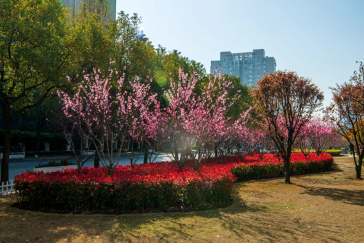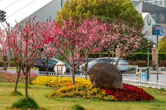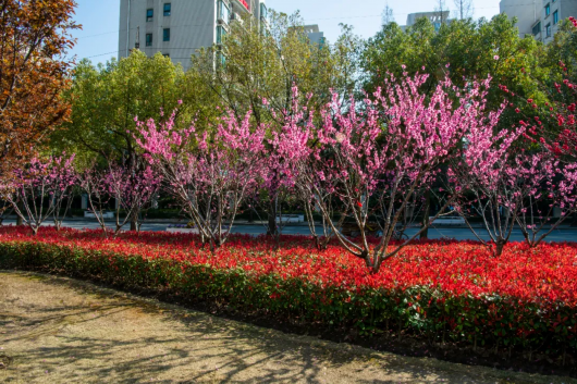 羽山路至灵山路段,精细化养护绿地种植了近7600㎡的桃花,包含大部分碧桃、果桃及少量帚桃,目前正是最佳观赏期。